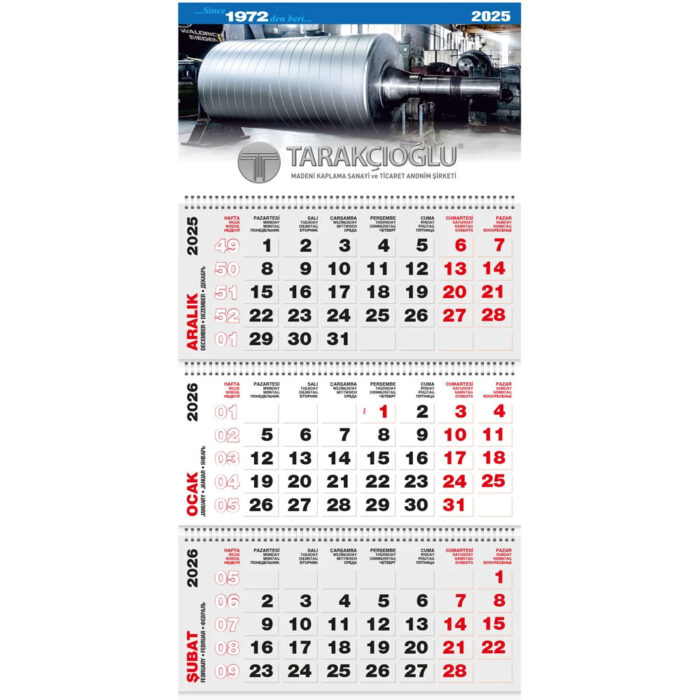 Üç Parça Spiralli Takvim Ebadı: 39,6 x 83 cm Alt / Üst Karton: 700gr. A. Bristol Reklam Alanı: 23 x